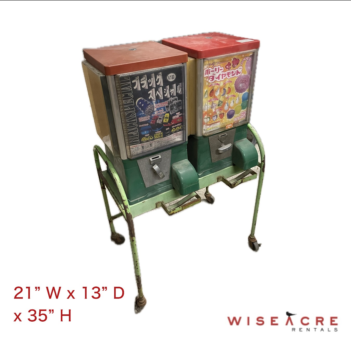 Commercial & Institutional, Vintage Japanese Vending Machine Set (Toy capsule or gum ball dispenser), 21" W, 13" D , 35" H, Green, Red