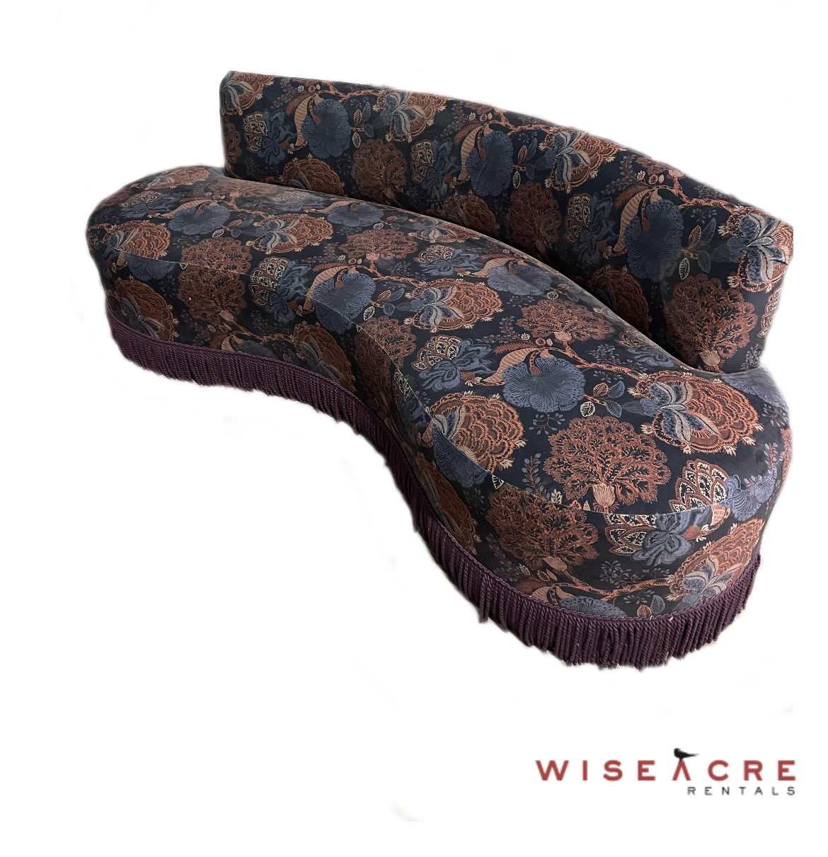 Furnishings, Curved patterned couch, 87'' W, 31'' H, 31'' D, Blue, Red, Fabric